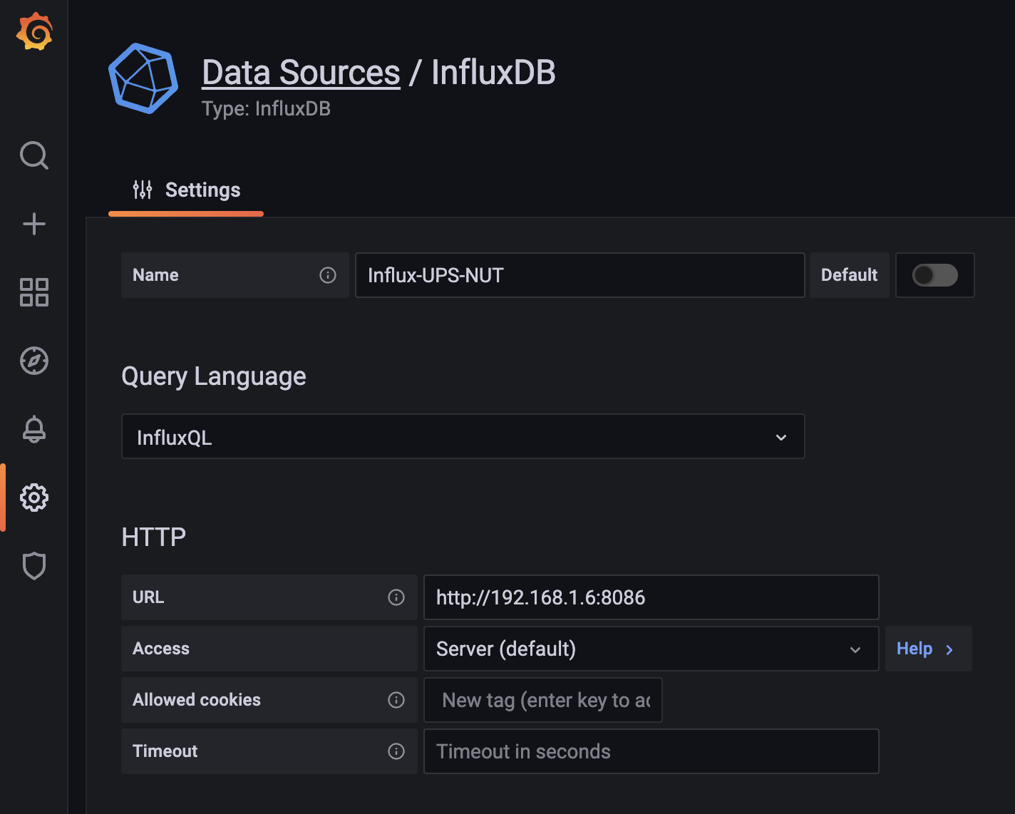 I then added the database to Grafana with a similar configuration to the other. The difference was that database was set to nut and HTTP Method was get to GET.