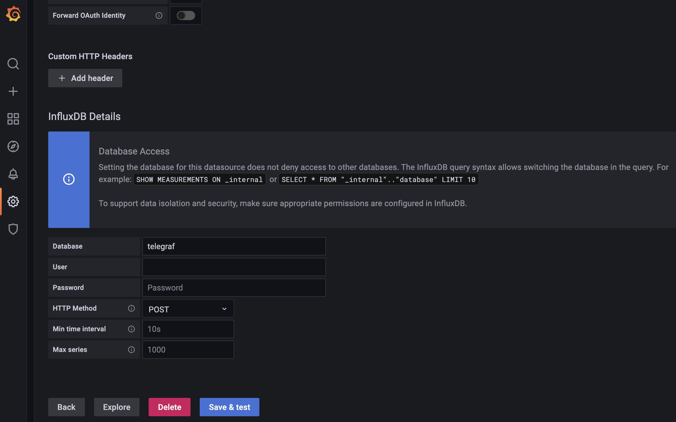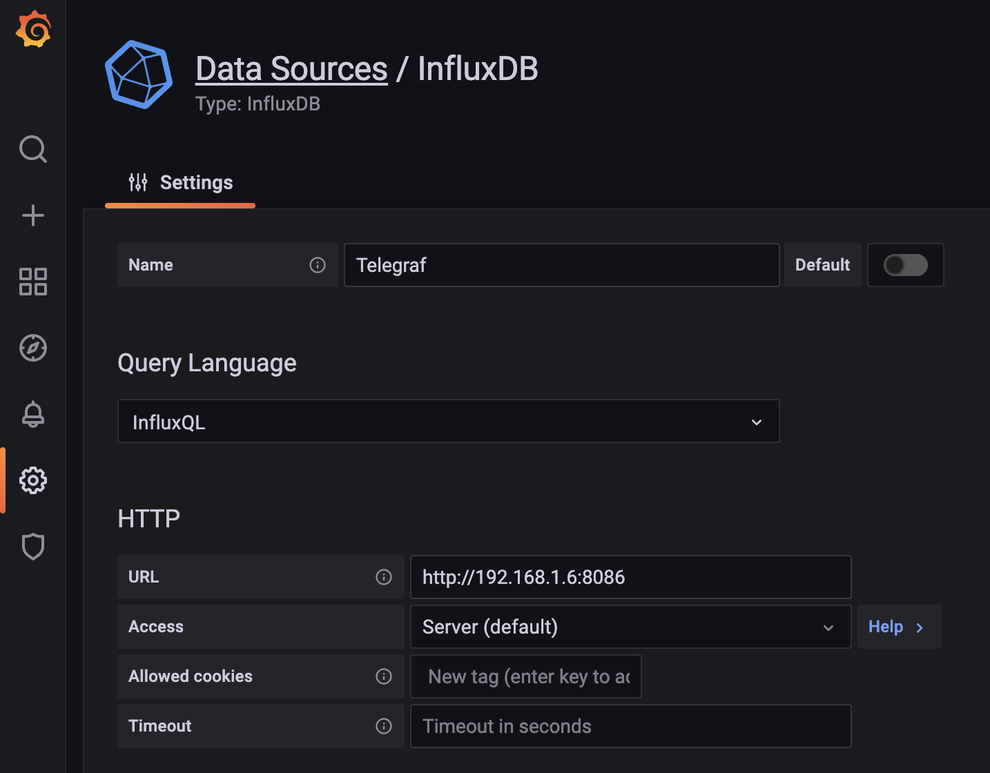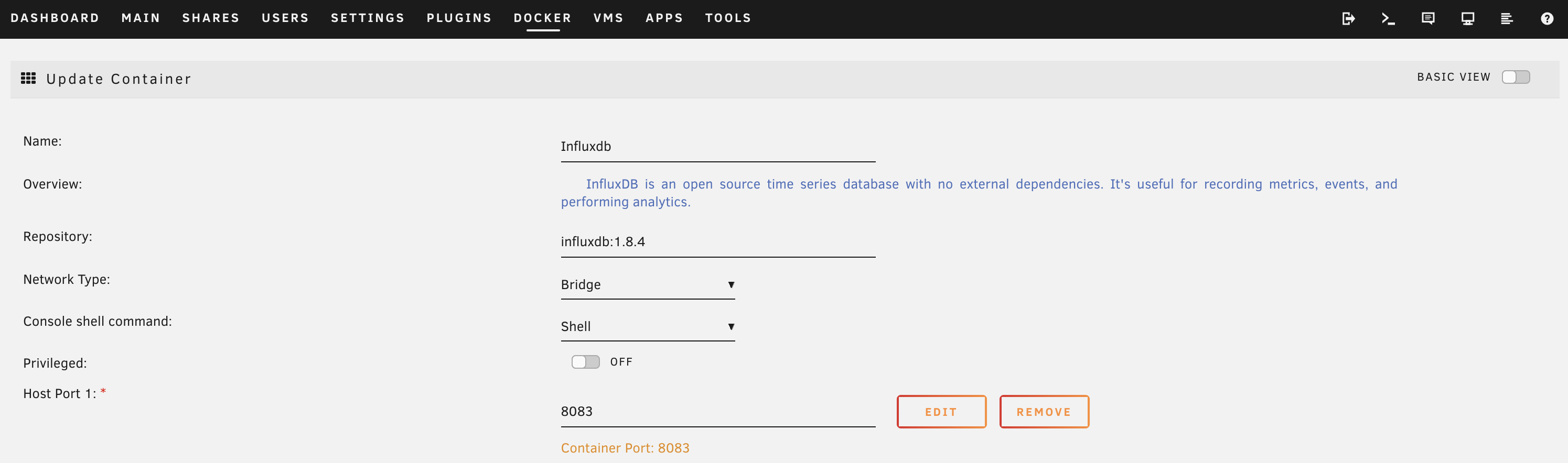 I changed the Name to one that I found suitable. The HTTP URL was set to the Unraid server and port 8086.