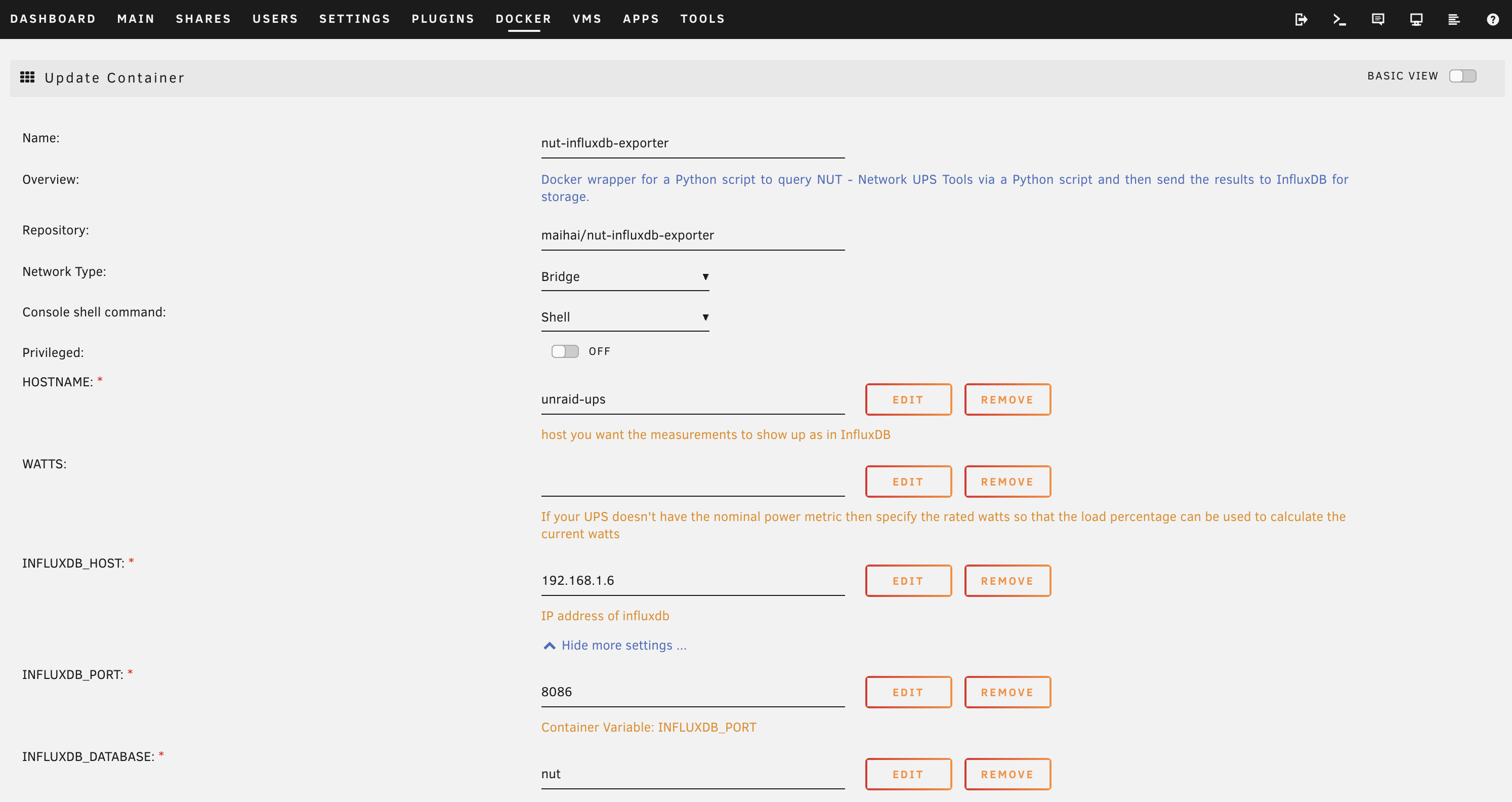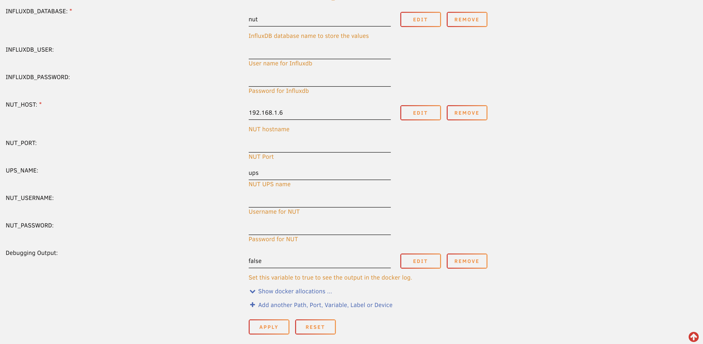 I changed INFLUXDB_HOST and NUT_HOST to my Unraid IP. My APC UPS reports nominal power so I removed WATTS/Nominal Power.