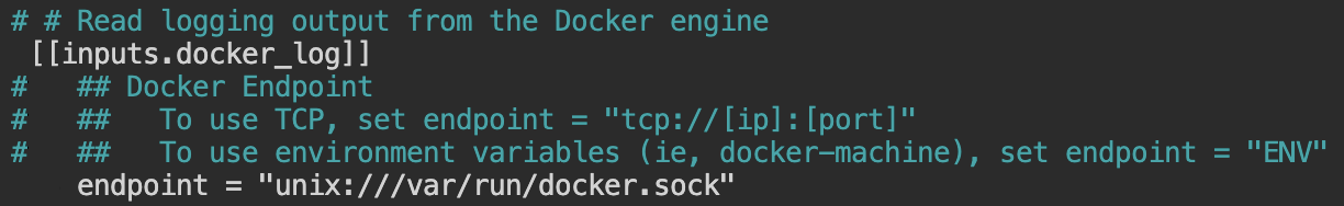 Finally, on line 7626 I uncommented endpoint = "unix:///var/run/docker.sock" as well.