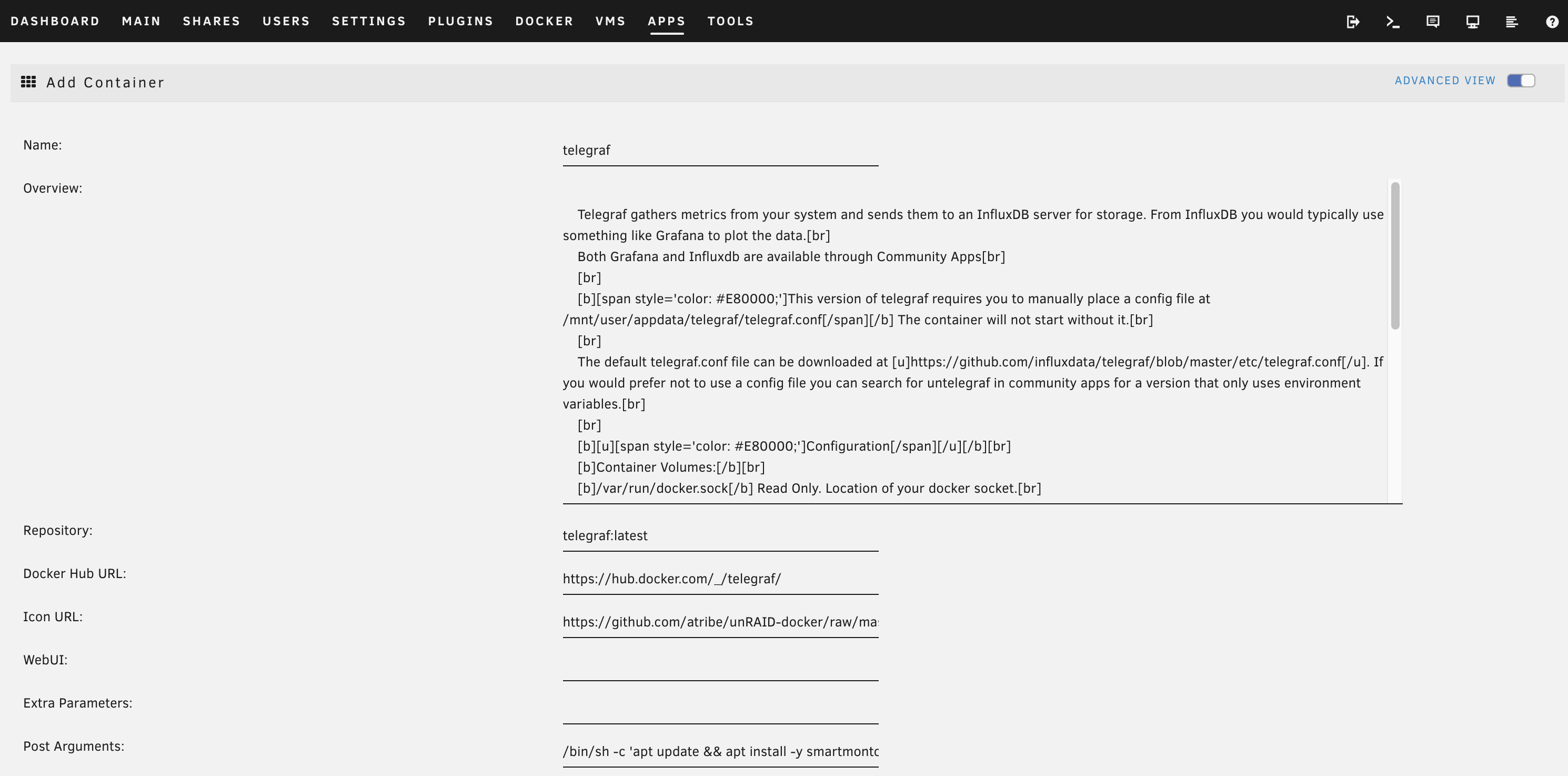 I saved the file and went back to the Telegraf configuration in Unraid. I turned on Advanced View and pasted the following in Post Arguements.
