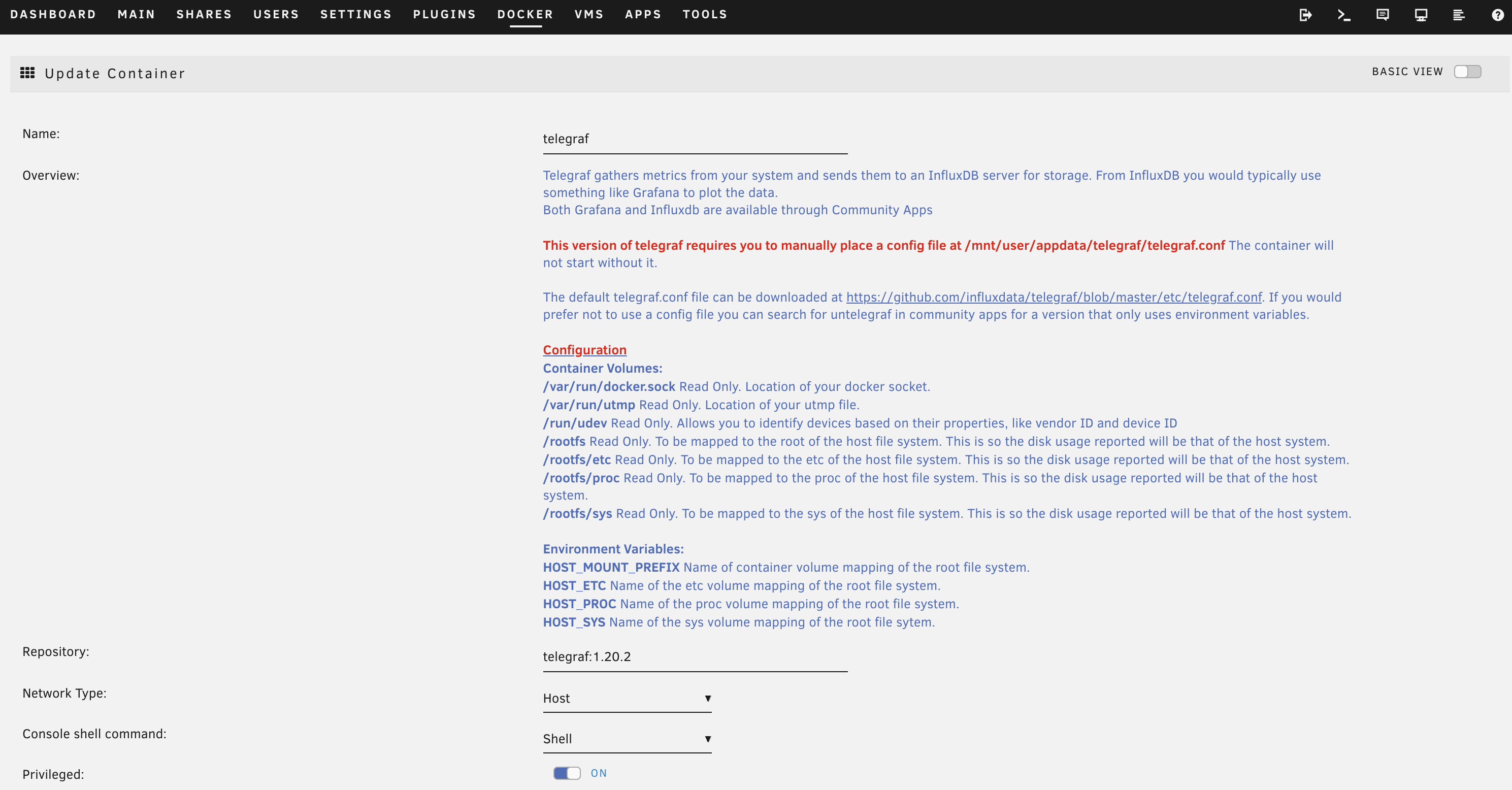 Luckily the installation for Telegraf is very simple. I searched for the app in the Community Apps and installed the default configuration.
